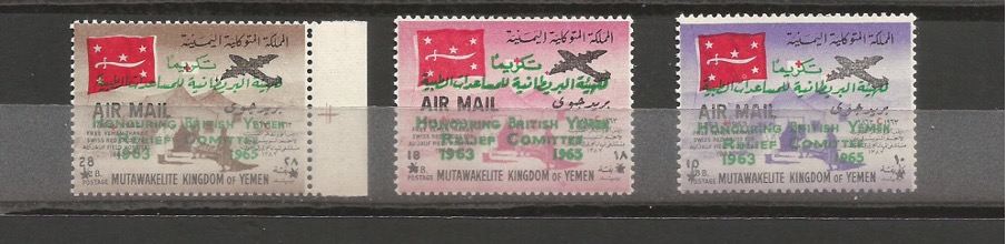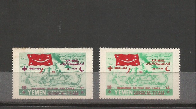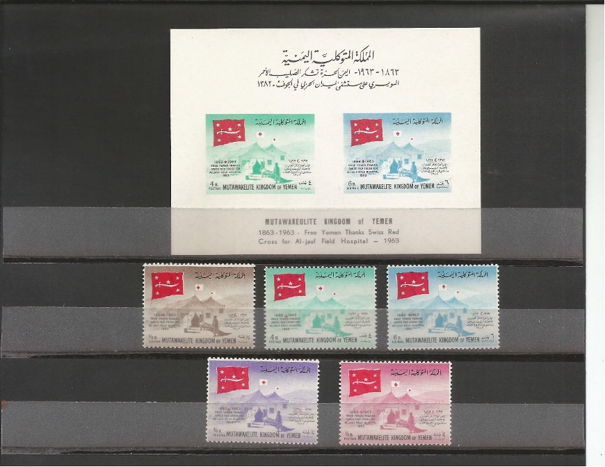 الإصدارات في ديسمبر من عام 1963 وافق الإمام البدر على إصدار مجموعة طوابع يشكر فيها الصليب الأحمر . السويسري على المستشفى الميداني. المجموعة مكونة من 5 طوابع بالإضافة الى بطاقة تذكاريه