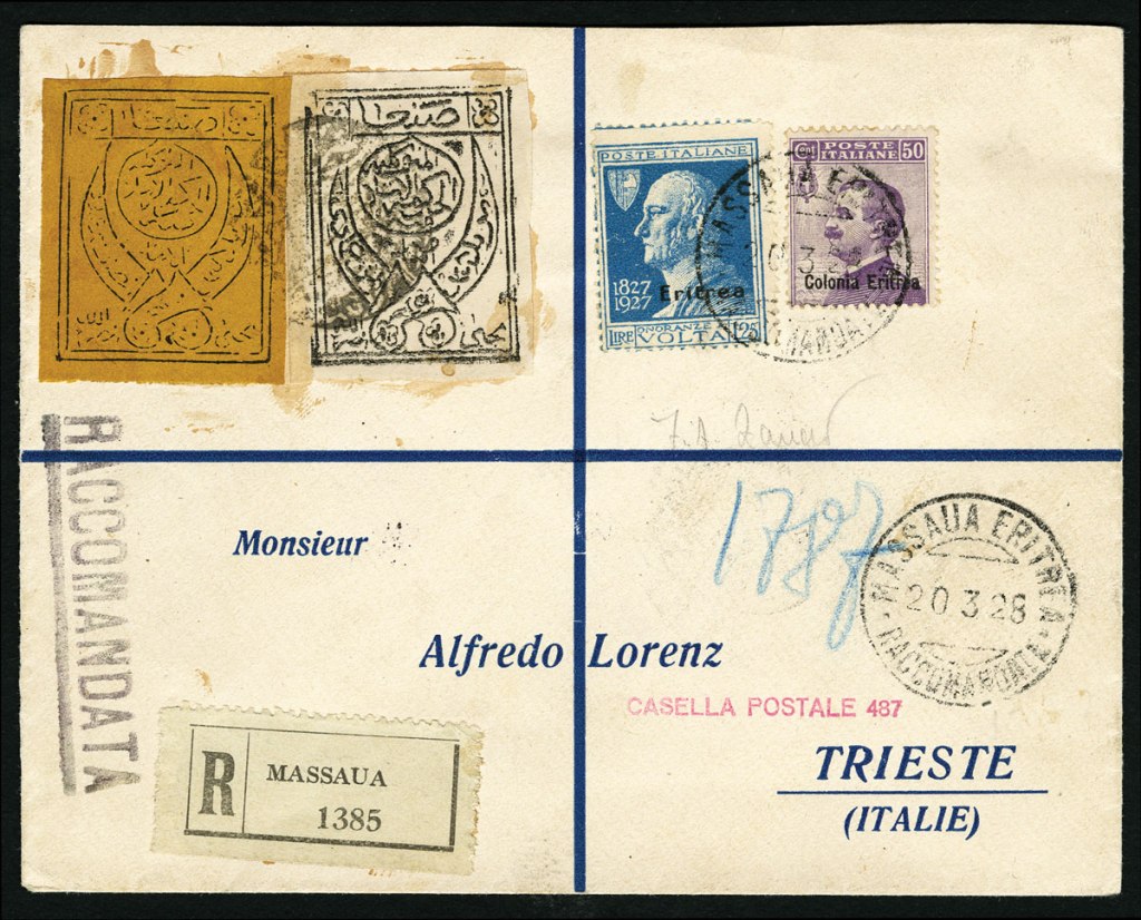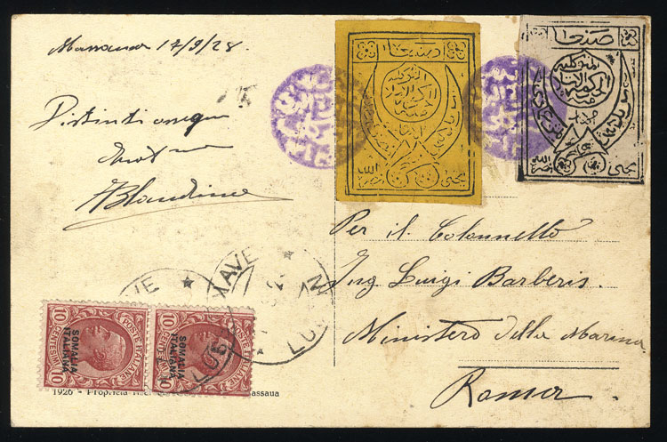 نجد هذا الظرف المسافر مرسل من صنعاء الى إيطاليا عن طريق مصوع في ارتيريا بعد إضافه طابعان قيمة الإرسال من ارتيريا الى إيطاليا