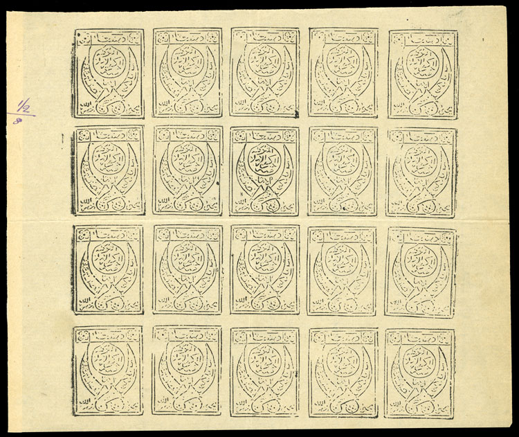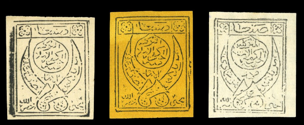 يعود تاريخ اول إصدار للملكة المتوكلية الى العام ١٩٢٦م ، حيث طبع اول طابعان على ورق ابيضّ من دون صمغ ومن دون شرشرة. كانت طريقة الطباعه على وضع عشرين “كليشيه” يحتوي على رسمة الطابع يتم ربطهم معاً ،وهذا نتج إلى تكوين ال Sheet أو فرخ مكون من ٤ طوابع عمودية و ٥ أفقي ممايجعل الإجمالي ٢٠ طابع لكل فرخ، هذا كله نتج ان جودة الطباعه كانت رديئه وغير متساويه ، فتجد طوابع زاد فيها كمية الحبر وأخرى قل فيها . تصميم الكليشيه بشكل يدوي جعل العديد من المتغيرات الثابته في كل فرخ