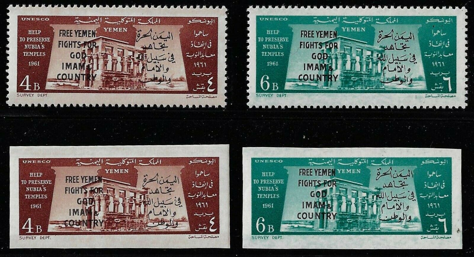 وفي الجانب الأخر وجدت القوات الجمهورية دعماً كامل من جمال عبدالناصر وتمت طباعة الطوابع في مصلحة المساحه في القاهرة ، واللتي اتسمت بالتشابه الكبير معى الإصدارات المصرية في هذه الفترة, على سبيل المثال وليس الحصر إصدار ” الحملة الدولية لمكافحة الجوع ” واللذي أصدر في مارس من عام 1963م مكون من طابعين باللإضافه الى بطاقة تذكاريه واللذي يعتبر نسخة طبق الأصل من الإصدار المصري والأختلاف في الفئة ووضع إسم الجمهورية العربية اليمنيه، ولكن في الحقيقة أن إصدارات الجمهورية العربية اليمنيه كانت أكثر إنتظاماً ودوريه وتمثل هوية الجمهورية العربية اليمنيه الجديده ، فنجد إصدارت الإحتفال بالذكرى الأولى للثورة اليمنيه وإفتتاح مطار صنعاء الدولي وبعض المصانع مثل الغزل والنسيج وإصدارات ذكرى الرئيس كينيدي . على الرغم من أن إصدارات الجمهورية العربية اليمنية أكثر من المملكة المتوكلية ، إلا أن إهتمام الهواة في الغرب كان ينصب أكثر في مصلحة الإصدارات الملكية لما لها من تفرد في التصميمات .