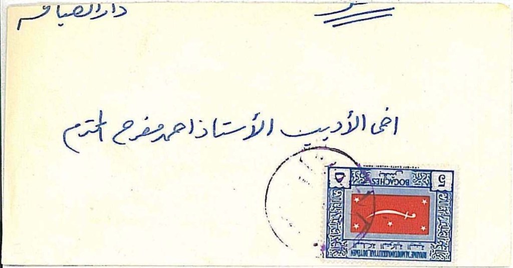 ظرف آخر مسافر من إب الى صنعاء يحمل طابع الـ ٣ بقشة وعليه ختم ٤ بقشة