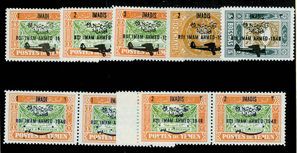 توشيح صنعاء- نيويورك احتفالاً بذهاب الامام سيف الاسلام الى نيويورك ، كتالوج ميشيل ٥٨-٦٣ و ٧٠-٧٦ باللون الاحمر والاسود.