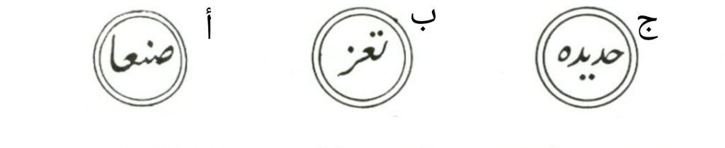 اول ختم تم تسجيله لبريد الدولة العثمانيه في اليمن كان في صنعاء (أ) عام ١٨٦٨م ، تعز (ب) عام ١٨٧١م ، الحديدة (ج) ١٨٧٣م . هذه الثلاث الاختام تم استعمالهم حتى عام ١٨٩٢م . لاحظ ان الختم يتكون من دائرتين يتوسطهم اسم المدينة وايضا عدم وجود الهمزة في صنعا.