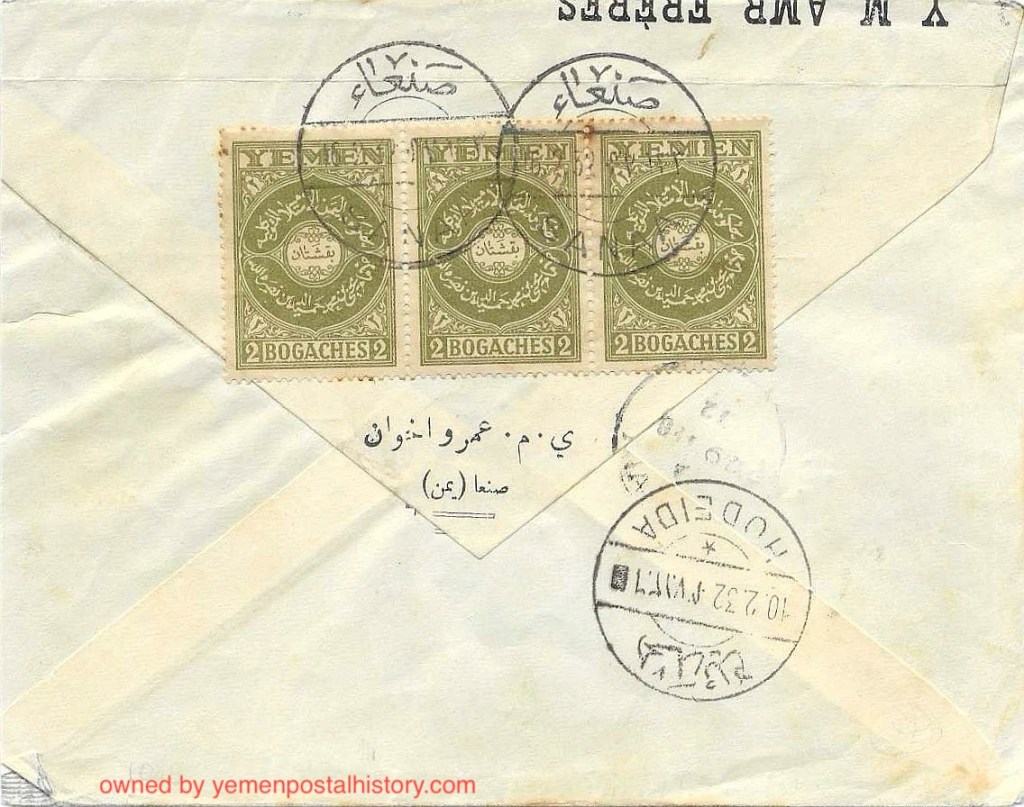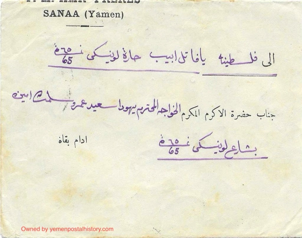 ظرف مسافر من صنعاء الي فلسطين – تل ابيب عن طريق الحديدة بقيمة ٦ بُقش ( ٢*٣) مختوم بأختام مكتب بريد صنعاء والحديدة – من النوع الثاني بتاريخ ١٠/٢/١٩٣٢ مقابله بالتاريخ الهجري. يُذكر ان هذه الوجهه غير مُعتادة . المُرسل اليه كما كُتب في آلظرف هوا “الخواجه المحترم يهودا سعيد عمرو سلمت امين”
